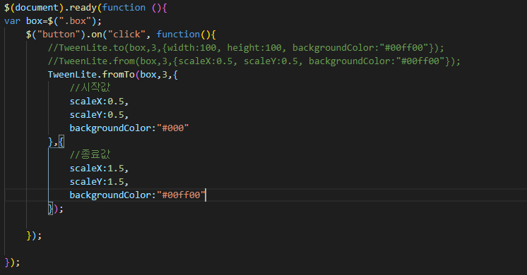 TweenLite.fromTo([Selector], [Duration], {시작Properties:end values},{종료Properties:end values})